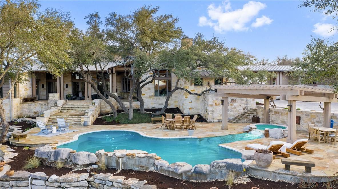 Nestled in the Hill Country, this Bee Cave home located in the equestrian community of Madrone Ranch is perfect for the horse enthusiast, complete with a barn on the property. Soaring beam ceilings allow in tons of natural light and stone accents give the home a rustic feel. The home really shines through its gigantic resort pool, with both covered and uncovered patios, and spa with a view.